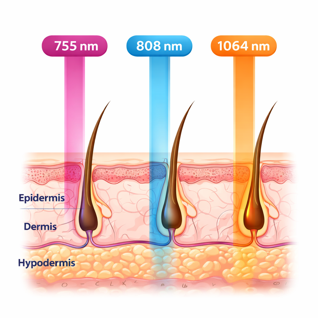- 808 nm – Dióda hullámhossz. A lézeres szőrtelenítés leggyakrabban használt hullámhossza. Mélyebb behatolás, hatékony kezelés karon, lábon és nagyobb testfelületeken.