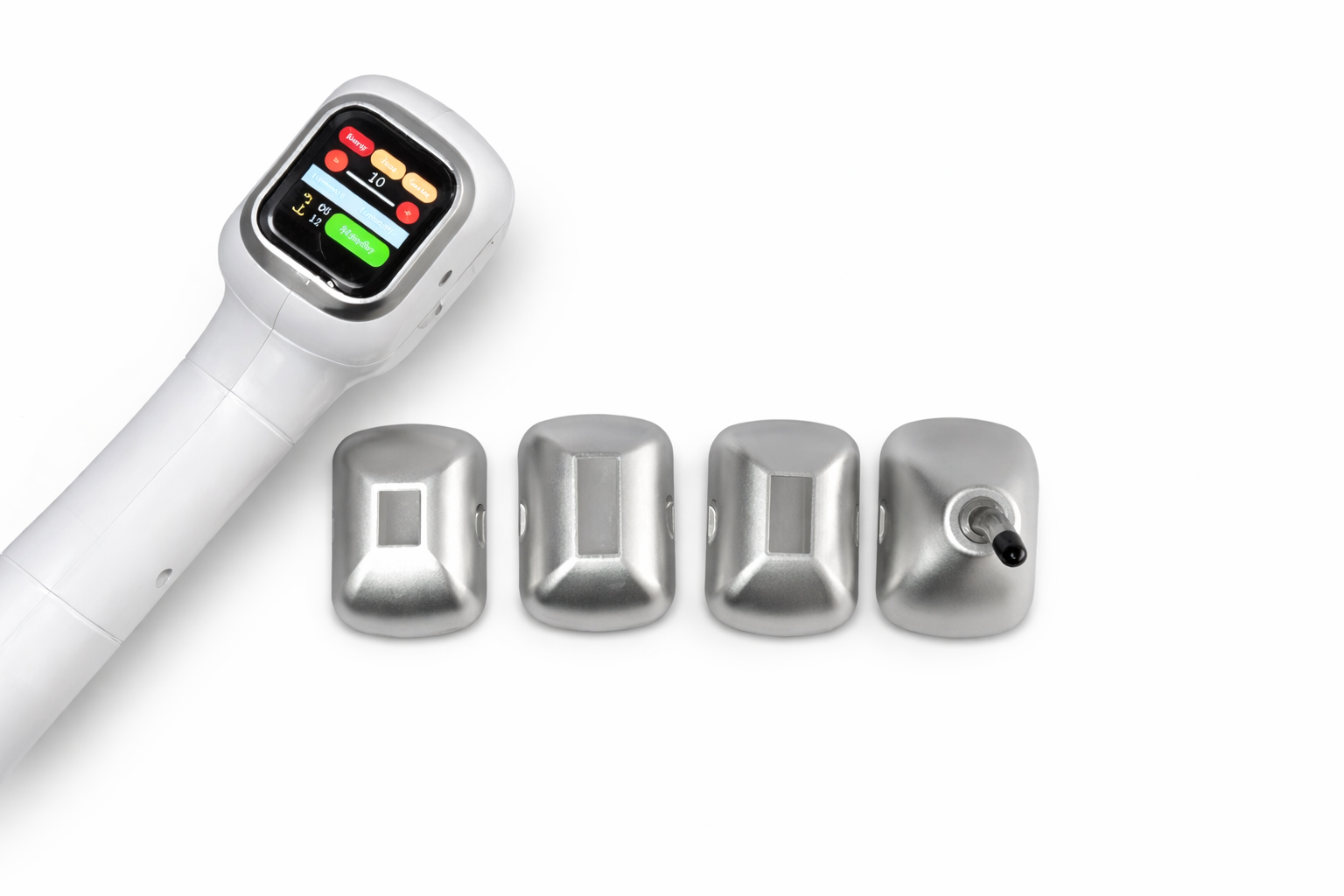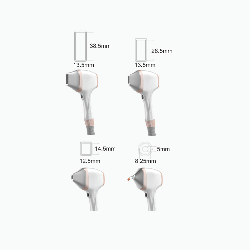 4 db cserélhető dióda lézer kezelőfej különböző spotméretekkel, amelyek lehetővé teszik a gyors és precíz kezelést nagyobb és kisebb testfelületeken egyaránt.