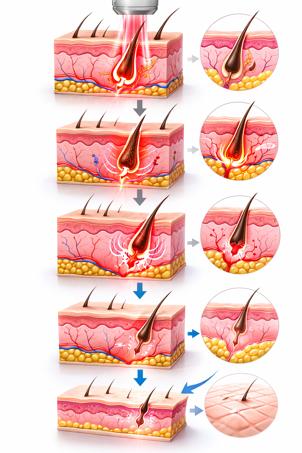 A dióda lézeres szőrtelenítés a szelektív fototermolízis elvén alapul. A lézerfény energiáját a pigmentált szőrszálak elnyelik és a szőrtüszőhöz vezetik, ahol hőhatás keletkezik. Ennek következtében a szőrtüsző és a szőrnövekedésért felelős mátrixsejtek károsodnak, így a szőrszál növekedése fokozatosan leáll. A kezelés elsősorban az anagén (növekedési) fázisban lévő szőrszálak esetében hatékony, ezért a kívánt eredmény eléréséhez több kezelésből álló kezeléssorozat szükséges. A folyamat során a környező bőrszövet nem károsodik, így a kezelés biztonságos, hatékony és tartós szőrcsökkenést eredményez.